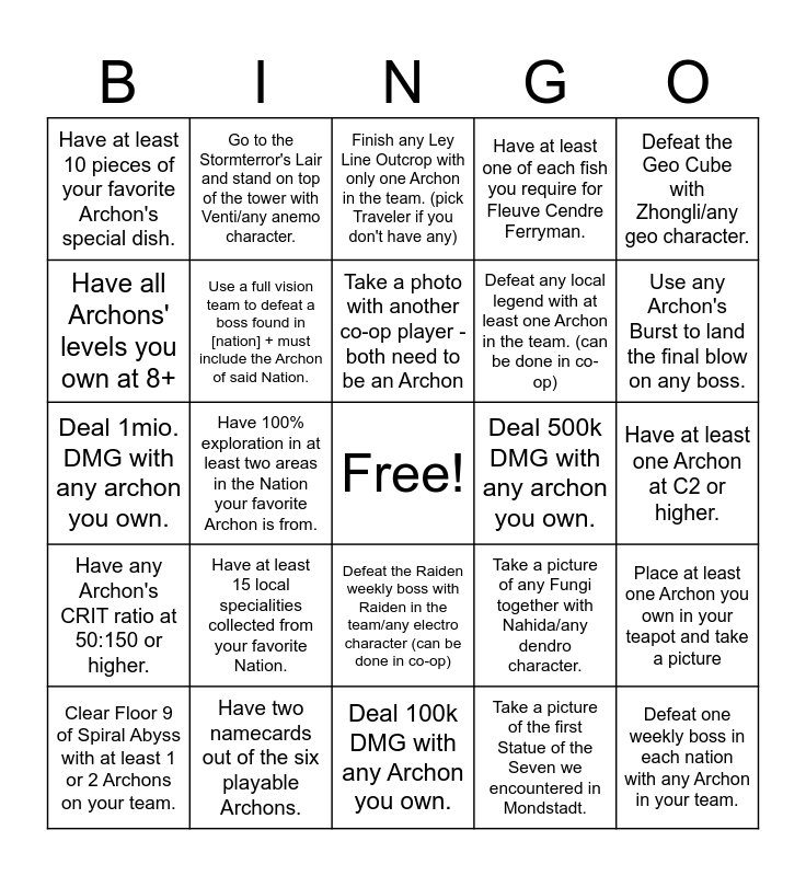 This bingo card has a free space and 24 words: Have at least 15 local specialities collected from your favorite Nation., Have two namecards out of the six playable Archons., Take a photo with another co-op player - both need to be an Archon, Clear Floor 9 of Spiral Abyss with at least 1 or 2 Archons on your team., Defeat the Geo Cube with Zhongli/any geo character., Have at least 10 pieces of your favorite Archon's special dish., Have all Archons' levels you own at 8+, Go to the Stormterror's Lair and stand on top of the tower with Venti/any anemo character., Deal 500k DMG with any archon you own., Defeat the Raiden weekly boss with Raiden in the team/any electro character (can be done in co-op), Defeat any local legend with at least one Archon in the team. (can be done in co-op), Deal 1mio. DMG with any archon you own., Take a picture of any Fungi together with Nahida/any dendro character., Place at least one Archon you own in your teapot and take a picture, Use a full vision team to defeat a boss found in [nation] + must include the Archon of said Nation., Take a picture of the first Statue of the Seven we encountered in Mondstadt., Have at least one Archon at C2 or higher., Finish any Ley Line Outcrop with only one Archon in the team. (pick Traveler if you don't have any), Use any Archon's Burst to land the final blow on any boss., Have 100% exploration in at least two areas in the Nation your favorite Archon is from., Defeat one weekly boss in each nation with any Archon in your team., Have any Archon's CRIT ratio at 50:150 or higher., Have at least one of each fish you require for Fleuve Cendre Ferryman. and Deal 100k DMG with any Archon you own..