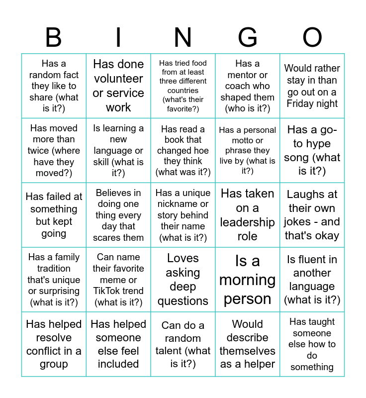 This bingo card has 28 words: Is fluent in another language (what is it?), Loves public speaking, Has a personal motto or phrase they live by (what is it?), Would describe themselves as a helper, Has moved more than twice (where have they moved?), Has tried food from at least three different countries (what's their favorite?), Has done volunteer or service work, Has a family tradition that's unique or surprising (what is it?), Has taken on a leadership role, Has helped resolve conflict in a group, Has failed at something but kept going, Has a mentor or coach who shaped them (who is it?), Has helped someone else feel included, Can do a random talent (what is it?), Has a go-to hype song (what is it?), Is a night owl, Can name their favorite meme or TikTok trend (what is it?), Is learning a new language or skill (what is it?), Has read a book that changed hoe they think (what was it?), Loves asking deep questions, Has a random fact they like to share (what is it?), Has taught someone else how to do something, Has a unique nickname or story behind their name (what is it?), Believes in doing one thing every day that scares them, Laughs at their own jokes - and that's okay, Is a morning person, Would rather stay in than go out on a Friday night and Has been the "new kid" in a group and knows how it feels.