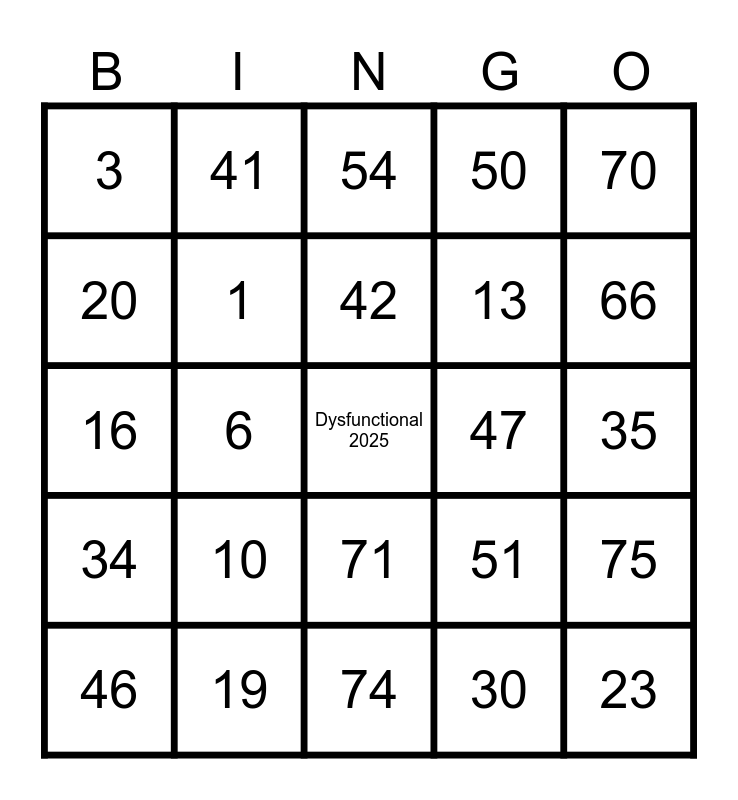 This bingo card has a free space and 24 words: 10, 19, 42, 46, 70, 3, 20, 41, 47, 71, 13, 16, 51, 75, 1, 30, 35, 54, 66, 6, 23, 34, 50 and 74.