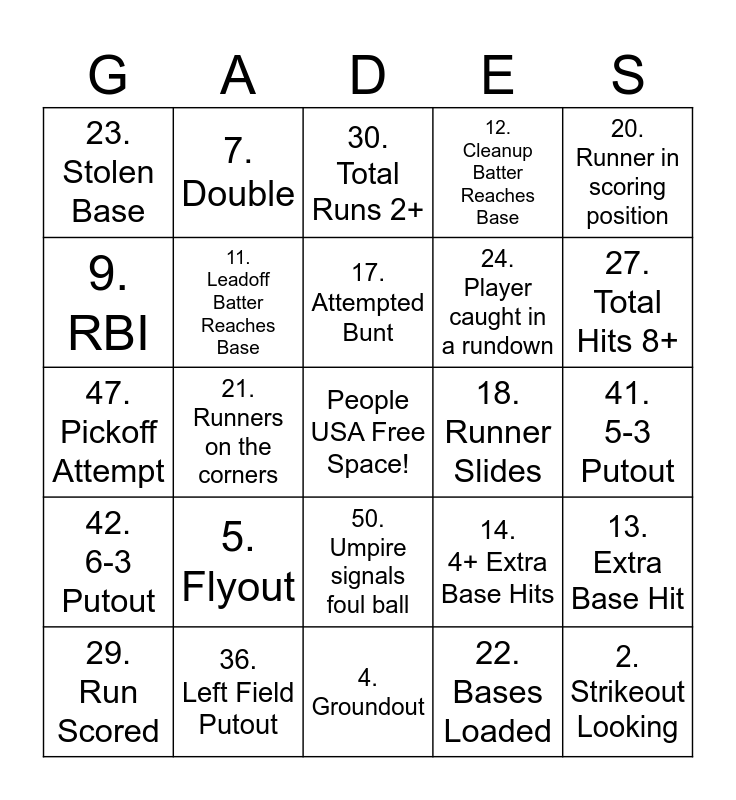 This bingo card has a free space and 51 words: 1. Strike Swinging, 2. Strikeout Looking, 3. Foul Ball, 4. Groundout, 5. Flyout, 6. Single, 7. Double, 8. Home Run, 9. RBI, 10. Full Count, 11. Leadoff Batter Reaches Base, 12. Cleanup Batter Reaches Base, 13. Extra Base Hit, 14. 4+ Extra Base Hits, 15. Walk or HBP, 16. Infield Hit, 17. Attempted Bunt, 18. Runner Slides, 19. Runner tags up and advances, 20. Runner in scoring position, 21. Runners on the corners, 22. Bases Loaded, 23. Stolen Base, 24. Player caught in a rundown, 25. Total Hits 6+, 26. Total Hits 7+, 27. Total Hits 8+, 28. Total Hits 9+, 29. Run Scored, 30. Total Runs 2+, 31. Total Runs 3+, 32. Total Runs 4+, 33. Total Runs 5+, 34. Second Base Putout, 35. Shortstop Putout, 36. Left Field Putout, 37. Center Field Putout, 38. Right Field Putout, 39. Out recorded in foul territory, 40. 1-3 Putout, 41. 5-3 Putout, 42. 6-3 Putout, 43. 6-4 Putout, 44. Double Play, 45. 123 Inning, 46. Wild Pitch/Passed Ball, 47. Pickoff Attempt, 48. Relief Pitcher K, 49. 4+ Pitchers in game, 50. Umpire signals foul ball and 51. Mound Visit.