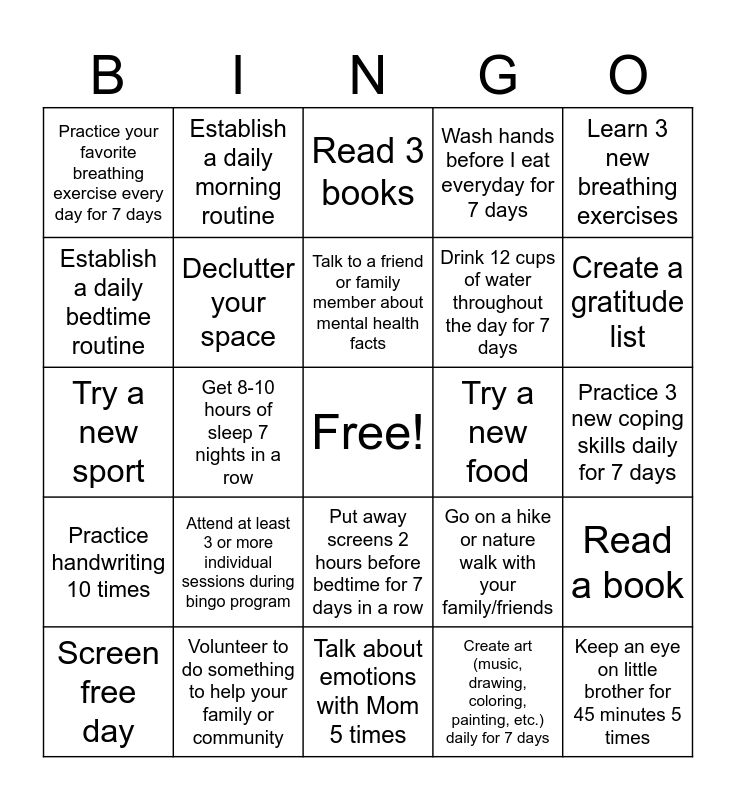 This bingo card has a free space and 24 words: Attend at least 3 or more individual sessions during bingo program, Volunteer to do something to help your family or community, Talk to a friend or family member about mental health facts, Screen free day, Learn 3 new breathing exercises, Practice your favorite breathing exercise every day for 7 days, Establish a daily bedtime routine, Establish a daily morning routine, Try a new food, Put away screens 2 hours before bedtime for 7 days in a row, Drink 12 cups of water throughout the day for 7 days, Try a new sport, Go on a hike or nature walk with your family/friends, Read a book, Declutter your space, Create art (music, drawing, coloring, painting, etc.) daily for 7 days, Practice 3 new coping skills daily for 7 days, Read 3 books, Create a gratitude list, Get 8-10 hours of sleep 7 nights in a row, Keep an eye on little brother for 45 minutes 5 times, Practice handwriting 10 times, Wash hands before I eat everyday for 7 days and Talk about emotions with Mom 5 times.