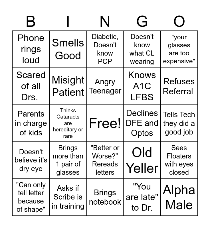 This bingo card has a free space and 24 words: Brings more than 1 pair of glasses, Asks if Scribe is in training, Angry Teenager, "Can only tell letter because of shape", "your glasses are too expensive", Phone rings loud, Scared of all Drs., Smells Good, Declines DFE and Optos, "Better or Worse?" Rereads letters, Knows A1C LFBS, Parents in charge of kids, Old Yeller, Sees Floaters with eyes closed, Misight Patient, "You are late" to Dr., Tells Tech they did a good job, Diabetic, Doesn't know PCP, Refuses Referral, Thinks Cataracts are hereditary or rare, Alpha Male, Doesn't believe it's dry eye, Doesn't know what CL wearing and Brings notebook.