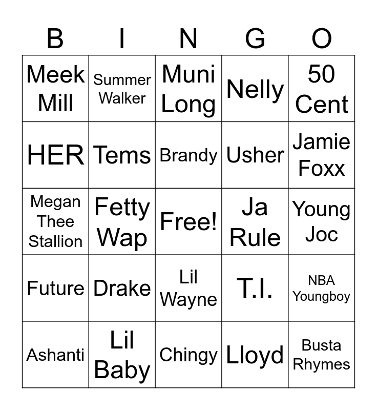 This bingo card has a free space and 24 words: Drake, Lil Baby, Brandy, Ashanti, 50 Cent, Meek Mill, HER, Summer Walker, Ja Rule, Lil Wayne, Usher, Megan Thee Stallion, T.I., NBA Youngboy, Tems, Lloyd, Young Joc, Muni Long, Jamie Foxx, Fetty Wap, Busta Rhymes, Future, Nelly and Chingy.