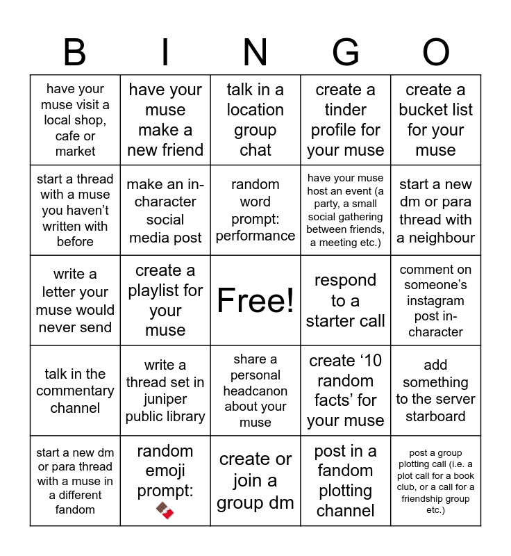 This bingo card has a free space and 24 words: write a thread set in juniper public library, random emoji prompt: š«, random word prompt: performance, start a new dm or para thread with a muse in a different fandom, create a bucket list for your muse, have your muse visit a local shop, cafe or market, start a thread with a muse you havenāt written with before, have your muse make a new friend, respond to a starter call, share a personal headcanon about your muse, have your muse host an event (a party, a small social gathering between friends, a meeting etc.), write a letter your muse would never send, create ā10 random factsā for your muse, add something to the server starboard, make an in-character social media post, post in a fandom plotting channel, comment on someoneās instagram post in-character, talk in a location group chat, start a new dm or para thread with a neighbour, create a playlist for your muse, post a group plotting call (i.e. a plot call for a book club, or a call for a friendship group etc.), talk in the commentary channel, create a tinder profile for your muse and create or join a group dm.