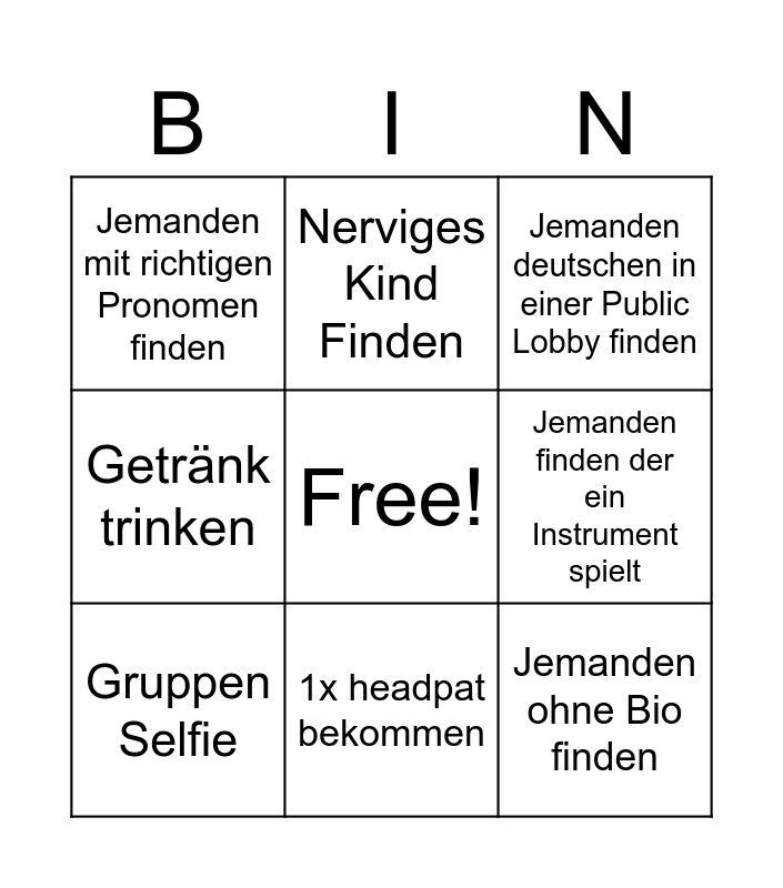 This bingo card has a free space and 8 words: Jemanden finden der ein Instrument spielt, Jemanden deutschen in einer Public Lobby finden, Nerviges Kind Finden, Gruppen Selfie, Jemanden mit richtigen Pronomen finden, Jemanden ohne Bio finden, Getränk trinken and 1x headpat bekommen.