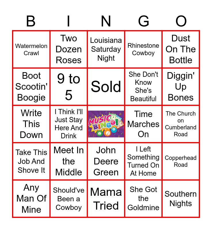 This bingo card has a free space and 24 words: Meet In the Middle, Should've Been a Cowboy, Sold, Any Man Of Mine, Dust On The Bottle, Watermelon Crawl, Boot Scootin' Boogie, Two Dozen Roses, Time Marches On, John Deere Green, She Don't Know She's Beautiful, Write This Down, I Left Something Turned On At Home, Copperhead Road, 9 to 5, She Got the Goldmine, The Church on Cumberland Road, Louisiana Saturday Night, Diggin' Up Bones, I Think I'll Just Stay Here And Drink, Southern Nights, Take This Job And Shove It, Rhinestone Cowboy and Mama Tried.