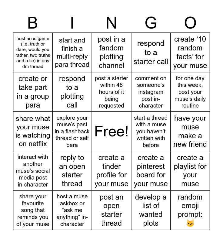 This bingo card has a free space and 48 words: write a thread set in that me espresso, random emoji prompt: š±, random word prompt: drama, post an open starter thread, reply to an open starter thread, write a self para or journal entry, start and finish a multi-reply para thread, make an in-character social media post, create or take part in a group para, create or join a group dm, respond to a plotting call, respond to a starter call, create a playlist for your muse, create a pinterest board for your muse, talk in a neighbourhood group chat, talk in a location group chat, post a starter within 48 hours of it being requested, start a thread with a muse you havenāt written with before, start a thread with a mun you havenāt written with before, create ā10 random factsā for your muse, explore your museās past in a flashback thread or self para, develop a list of wanted plots, host an ic game (i.e. truth or dare, would you rather, two truths and a lie) in any dm thread, comment on someoneās instagram post in-character, start a new dm or para thread with a muse in a different fandom, for one day this week, post your museās daily routine, share your favourite song that reminds you of your muse, start a thread between two muses that have never interacted before, create a tinder profile for your muse, interact with another museās social media post in-character, purchase an item in the server shop, share a personal headcanon about your muse, write a letter your muse would never send, talk in the commentary channel, host a muse askbox or āask me anythingā in-character, share a themed playlist for a specific mood or event your muse has experienced, have your muse host an event (a party, a small social gathering between friends, a meeting etc.), have your muse make a new friend, add something to the server starboard, post a museās top 5 guilty pleasures, create a bucket list for your muse, post a group plotting call (i.e. a plot call for a book club, or a call for a friendship group etc.), post in a fandom plotting channel, post a tweet for your muse, share what your muse is watching on netflix, log an activity that your muse did, share your museās google search history and post what your muse is listening to on spotify.