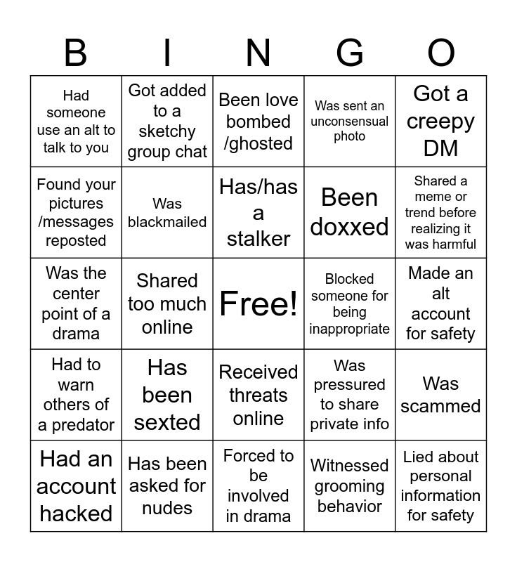 This bingo card has a free space and 24 words: Has been sexted, Has been asked for nudes, Has/has a stalker, Had an account hacked, Got a creepy DM, Had someone use an alt to talk to you, Found your pictures /messages reposted, Got added to a sketchy group chat, Blocked someone for being inappropriate, Received threats online, Been doxxed, Was the center point of a drama, Was pressured to share private info, Was scammed, Was blackmailed, Witnessed grooming behavior, Made an alt account for safety, Been love bombed /ghosted, Shared a meme or trend before realizing it was harmful, Shared too much online, Lied about personal information for safety, Had to warn others of a predator, Was sent an unconsensual photo and Forced to be involved in drama.