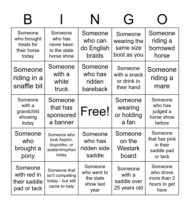This bingo card has a free space and 34 words: Someone riding a horse with Blue Eyes, Someone with a saddle over 25 years old, Someone entered in speed AND judged events, Someone riding a gelding, Someone who brought a pony, Someone with a white truck, Someone riding a borrowed horse, Someone with red in their saddle pad or tack, Someone who has never been to the state horse show, Someone who is currently winning highpoint in an event, Someone who has ridden bareback, Someone who can do English braids, Someone who has been to all 5 Westark Shows this year, Someone who wears the same size cowboy hat as you, Someone wearing or holding a fan, Someone riding a mare, Someone that isn't competing today - but still came to help, Someone with a grandchild showing today, Someone who took Aspirin, ibuprofen, or acetaminophen today, Someone on the Westark board, Someone who has ridden side saddle, Someone who has been a Westark Queen, Someone who brought treats for their horse today, Someone who has judged a horse show before, Someone who went to the state show last year, Someone who drove more than 2 hours to get here, Someone wearing the same size boot as you, Someone riding a paint, Someone with a snack or drink in their hand, Someone riding in a snaffle bit, Someone using a saddle sack or saddle bag, Someone that has sponsored a banner, Someone that has pink in their saddle pad or tack and Someone wearing a Westark t-shirt.