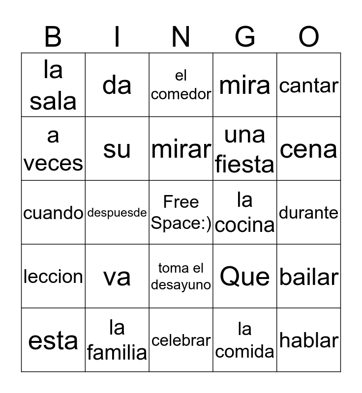 This bingo card has a free space and 24 words: va, la familia, mirar, esta, cantar, la sala, a veces, da, la cocina, toma el desayuno, una fiesta, cuando, Que, bailar, su, la comida, durante, el comedor, cena, despuesde, hablar, leccion, mira and celebrar.