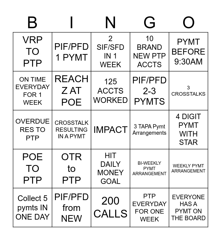 This bingo card has a free space and 24 words: OTR to PTP, PIF/PFD from NEW, 125 ACCTS WORKED, Collect 5 pymts IN ONE DAY, PYMT BEFORE 9:30AM, VRP TO PTP, ON TIME EVERYDAY FOR 1 WEEK, PIF/PFD 1 PYMT, 3 TAPA Pymt Arrangements, HIT DAILY MONEY GOAL, PIF/PFD 2-3 PYMTS, OVERDUE RES TO PTP, BI-WEEKLY PYMT ARRANGEMENT, WEEKLY PYMT ARRANGEMENT, REACH Z AT POE, PTP EVERYDAY FOR ONE WEEK, 4 DIGIT PYMT WITH STAR, 2 SIF/SFD IN 1 WEEK, 3 CROSSTALKS, CROSSTALK RESULTING IN A PYMT, EVERYONE HAS A PYMT ON THE BOARD, POE TO PTP, 10 BRAND NEW PTP ACCTS and 200 CALLS.