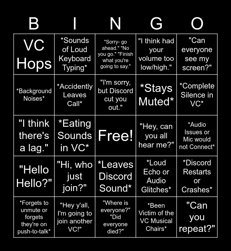 This bingo card has a free space and 24 words: "Hi, who just join?", "Hey y'all, I'm going to join another VC!", "I'm sorry, but Discord cut you out.", *Forgets to unmute or forgets they're on push-to-talk*, "Can everyone see my screen?", VC Hops, *Background Noises*, *Sounds of Loud Keyboard Typing*, "Hey, can you all hear me?", *Leaves Discord Sound*, *Stays Muted*, "I think there's a lag.", *Loud Echo or Audio Glitches*, *Discord Restarts or Crashes*, *Accidently Leaves Call*, *Been Victim of the VC Musical Chairs*, *Audio Issues or Mic would not Connect*, "Sorry- go ahead." "No you go." "Finish what you're going to say.", *Complete Silence in VC*, *Eating Sounds in VC*, "Can you repeat?", "Hello Hello?", "I think had your volume too low/high." and "Where is everyone?" "Did everyone died?".