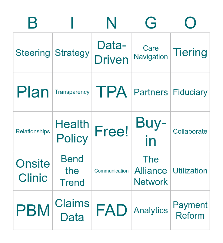This bingo card has a free space and 24 words: Bend the Trend, Claims Data, TPA, PBM, Tiering, Steering, Plan, Strategy, Buy-in, Communication, Partners, Relationships, The Alliance Network, Utilization, Transparency, Analytics, Collaborate, Data-Driven, Fiduciary, Health Policy, Payment Reform, Onsite Clinic, Care Navigation and FAD.