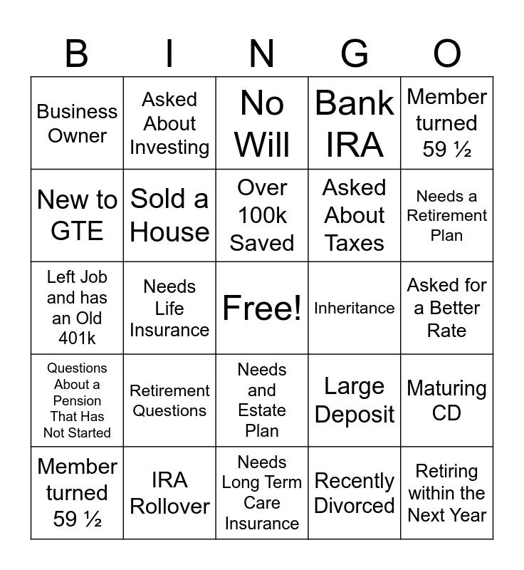 This bingo card has a free space and 24 words: Retirement Questions, IRA Rollover, Over 100k Saved, Member turned 59 ½, Member turned 59 ½, Business Owner, New to GTE, Asked About Investing, Inheritance, Needs and Estate Plan, Asked About Taxes, Left Job and has an Old 401k, Large Deposit, Maturing CD, Sold a House, Recently Divorced, Asked for a Better Rate, No Will, Needs a Retirement Plan, Needs Life Insurance, Retiring within the Next Year, Questions About a Pension That Has Not Started, Bank IRA and Needs Long Term Care Insurance.