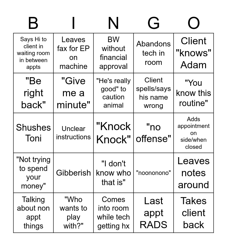 This bingo card has a free space and 24 words: Gibberish, "Who wants to play with?", "He's really good" to caution animal, Talking about non appt things, Client "knows" Adam, Says Hi to client in waiting room in between appts, "Be right back", Leaves fax for EP on machine, "no offense", "I don't know who that is", Client spells/says his name wrong, Shushes Toni, "noononono", Leaves notes around, "Give me a minute", Last appt RADS, Adds appointment on side/when closed, BW without financial approval, "You know this routine", Unclear instructions, Takes client back, "Not trying to spend your money", Abandons tech in room and Comes into room while tech getting hx.