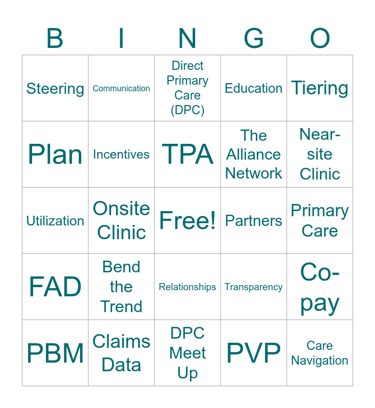 This bingo card has a free space and 24 words: Bend the Trend, Claims Data, TPA, PBM, Tiering, Steering, Plan, Communication, Partners, Relationships, The Alliance Network, Utilization, Transparency, Co-pay, Incentives, PVP, Primary Care, Direct Primary Care (DPC), Near-site Clinic, Onsite Clinic, Care Navigation, FAD, Education and DPC Meet Up.
