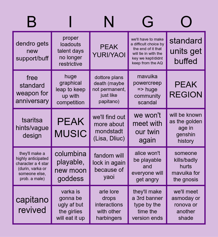 This bingo card has 25 words: columbina playable, new moon goddess, arle lore drops interactions with other harbingers, dottore plans death (maybe not permanent, just like papitano), capitano revived, standard units get buffed, dendro gets new support/buff, free standard weapon for anniversary, proper loadouts talent days no longer restrictive, we won't meet with our twin again, fandom will lock in again because of yaoi, mavuika powercreep => huge community scandal, tsaritsa hints/vague design, alice won't be playable and everyone will get angry, someone kills/badly hurts mavuika for the gnosis, huge graphical leap to keep up with competition, we'll meet asmoday or ronova or another shade, will be known as the golden age in genshin history, PEAK YURI/YAOI, PEAK REGION, PEAK MUSIC, we'll find out more about mondstadt (Lisa, Dliuc), varka is gonna be ugly af but the girlies will eat it up, they'll make a highly anticipated character a 4 star (durin, varka or someone else, prob. a male), we'll have to make a difficult choice by the end of it that will tie in with the key we kept/didnt keep from the AQ and they'll make a 3rd banner type by the time the version ends.