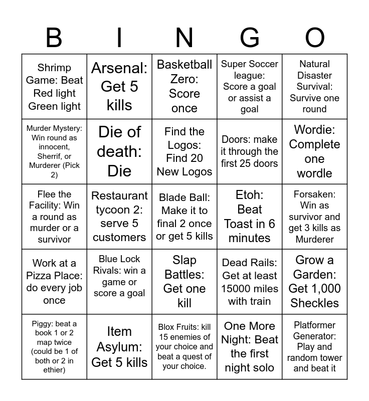 This bingo card has a free space and 24 words: Blue Lock Rivals: win a game or score a goal, Item Asylum: Get 5 kills, Find the Logos: Find 20 New Logos, Piggy: beat a book 1 or 2 map twice (could be 1 of both or 2 in ethier), Natural Disaster Survival: Survive one round, Shrimp Game: Beat Red light Green light, Murder Mystery: Win round as innocent, Sherrif, or Murderer (Pick 2), Arsenal: Get 5 kills, Etoh: Beat Toast in 6 minutes, Slap Battles: Get one kill, Doors: make it through the first 25 doors, Flee the Facility: Win a round as murder or a survivor, Dead Rails: Get at least 15000 miles with train, Grow a Garden: Get 1,000 Sheckles, Die of death: Die, One More Night: Beat the first night solo, Forsaken: Win as survivor and get 3 kills as Murderer, Basketball Zero: Score once, Wordie: Complete one wordle, Restaurant tycoon 2: serve 5 customers, Platformer Generator: Play and random tower and beat it, Work at a Pizza Place: do every job once, Super Soccer league: Score a goal or assist a goal and Blox Fruits: kill 15 enemies of your choice and beat a quest of your choice..