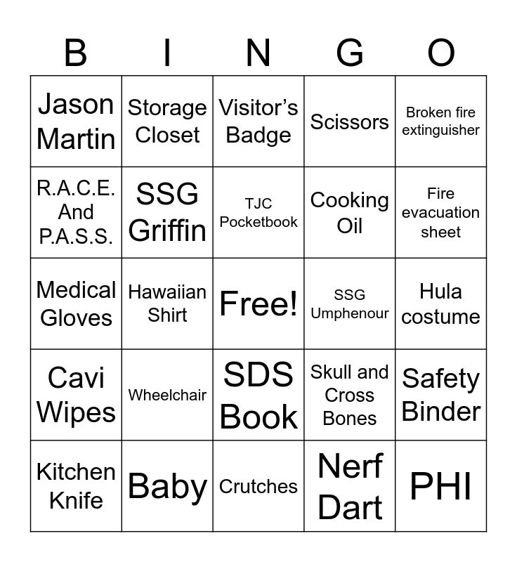This bingo card has a free space and 29 words: Kitchen Knife, Horse, Hawaiian Shirt, Wanted Sign, Jason Martin, Visitor’s Badge, SSG Griffin, Wheelchair, SSG Umphenour, Baby, Hula costume, PHI, Crutches, Nerf Dart, Fire evacuation sheet, SPC Wiggins, SDS Book, Cavi Wipes, Broken fire extinguisher, Medical Gloves, Skull and Cross Bones, Crockpot, Cooking Oil, R.A.C.E. And P.A.S.S., Scissors, Storage Closet, Safety Binder, TJC Pocketbook and Fedora.