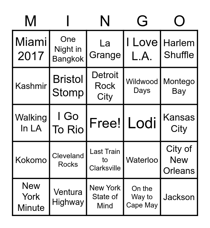 This bingo card has a free space and 37 words: Allentown, An Englishman in New York, Angel of Harlem, Bristol Stomp, City of New Orleans, Cleveland Rocks, Detroit Rock City, Do You Know the Way to San Jose, Harlem Shuffle, Hollywood Nights, I Go To Rio, I Love L.A., Jackson, Kansas City, Kashmir, Kokomo, L.A. Woman, La Grange, Last Train to Clarksville, Lodi, Miami 2017, Montego Bay, New York Minute, New York State of Mind, Night Boat to Cairo, On the Way to Cape May, One Night in Bangkok, Philadelphia Freedom, Spanish Harlem, The Little Old Lady from Pasadena, The Night Chicago Died, Ventura Highway, Walking In LA, Walking In Memphis, Waterloo, Wildwood Days and Zanzibar.