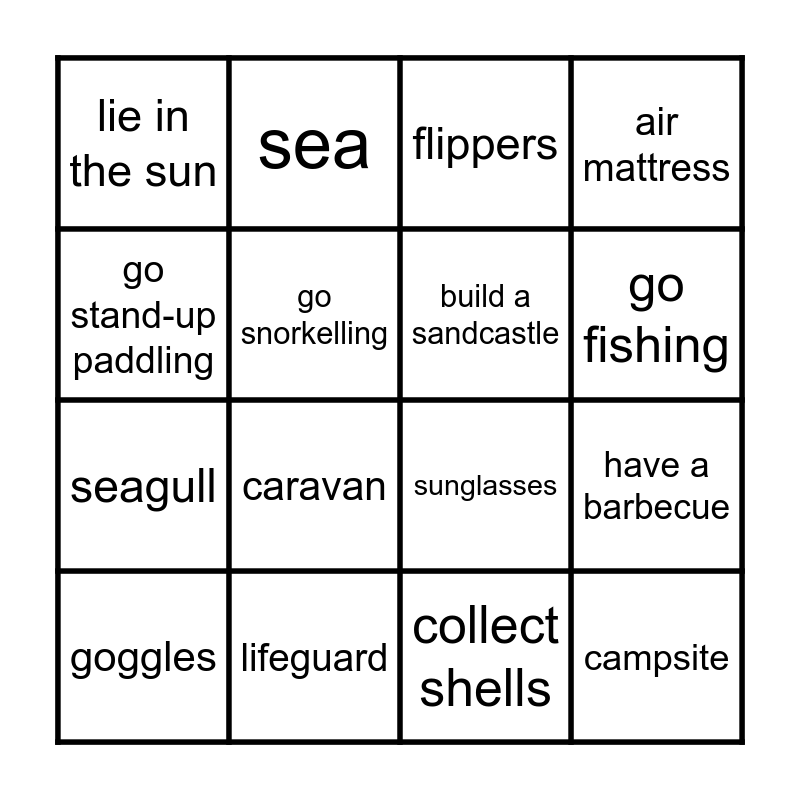 This bingo card has 16 words: lifeguard, have a barbecue, flippers, lie in the sun, seagull, sea, sunglasses, collect shells, go stand-up paddling, go snorkelling, goggles, air mattress, caravan, go fishing, build a sandcastle and campsite.