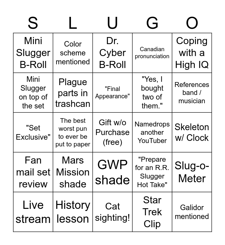 This bingo card has a free space and 24 words: Mars Mission shade, History lesson, "Final Appearance", Live stream, Coping with a High IQ, Mini Slugger B-Roll, Mini Slugger on top of the set, Color scheme mentioned, Namedrops another YouTuber, GWP shade, "Yes, I bought two of them.", "Set Exclusive", "Prepare for an R.R. Slugger Hot Take", Slug-o-Meter, Plague parts in trashcan, Star Trek Clip, Skeleton w/ Clock, Dr. Cyber B-Roll, References band / musician, The best worst pun to ever be put to paper, Galidor mentioned, Fan mail set review, Canadian pronunciation and Cat sighting!.