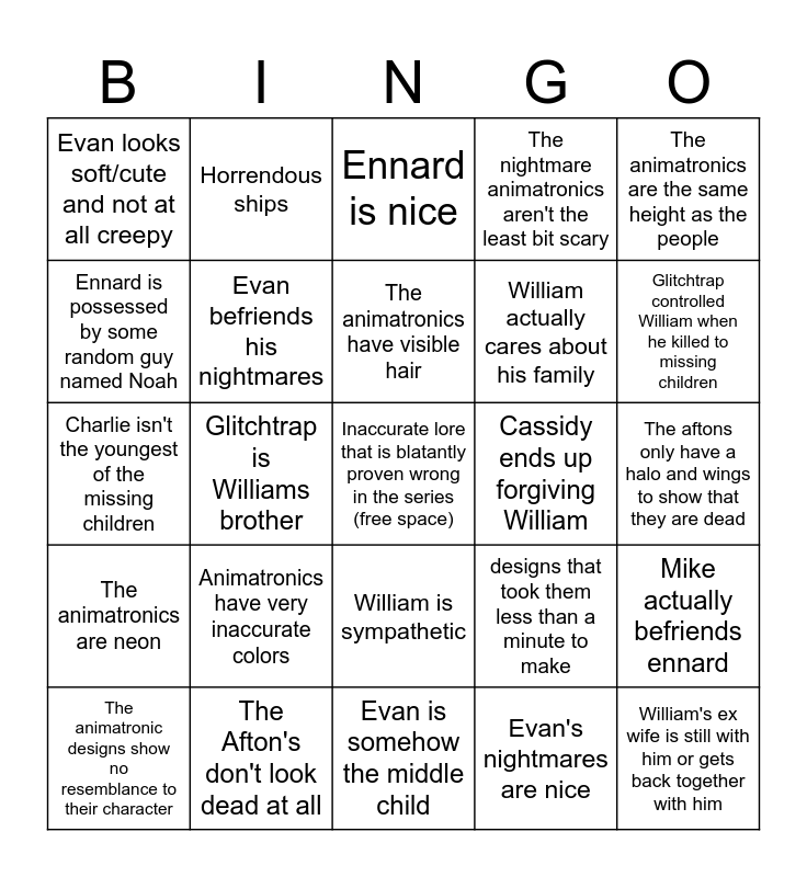 This bingo card has a free space and 24 words: Animatronics have very inaccurate colors, The Afton's don't look dead at all, The animatronics have visible hair, The animatronic designs show no resemblance to their character, The animatronics are the same height as the people, Evan looks soft/cute and not at all creepy, Ennard is possessed by some random guy named Noah, Horrendous ships, Cassidy ends up forgiving William, William is sympathetic, William actually cares about his family, Charlie isn't the youngest of the missing children, designs that took them less than a minute to make, Mike actually befriends ennard, Evan befriends his nightmares, Evan's nightmares are nice, The aftons only have a halo and wings to show that they are dead, Ennard is nice, Glitchtrap controlled William when he killed to missing children, Glitchtrap is Williams brother, William's ex wife is still with him or gets back together with him, The animatronics are neon, The nightmare animatronics aren't the least bit scary and Evan is somehow the middle child.