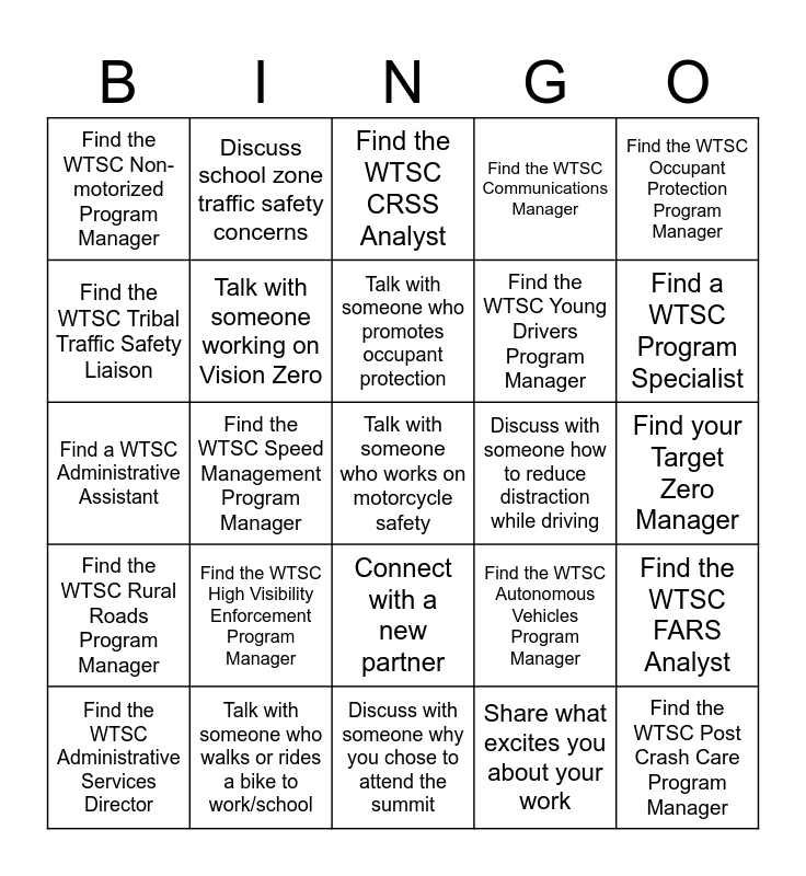 This bingo card has 68 words: Free!, Talk with someone who works on motorcycle safety, Talk with someone who works on pedestrian safety, Talk with someone who promotes focused driving, Talk with someone who works on slowing traveling speeds, Talk with someone who works on impaired driving prevention, Discuss school zone traffic safety concerns, Discuss work zone traffic safety concerns, Talk with someone who promotes occupant protection, Ask someone about what they learned, Connect with a new partner, Discuss a policy or legislation, Find your Target Zero Manager, Find the WTSC Occupant Protection Program Manager, Find the WTSC Focused Driving Program Manager, Find the WTSC Tribal Traffic Safety Liaison, Find the WTSC Speed Management Program Manager, Find the WTSC Non-motorized Program Manager, Find the WTSC Impaired Driving Program Manager, Find the WTSC High Visibility Enforcement Program Manager, Find the WTSC Young Drivers Program Manager, Find the WTSC Autonomous Vehicles Program Manager, Find the WTSC Rural Roads Program Manager, Find the WTSC Post Crash Care Program Manager, Find the WTSC Motorcycles Program Manager, Find the WTSC Program Director, Find the WTSC Research and Data Division Director, Find the WTSC Traffic Records Program Manager, Find the WTSC FARS Analyst, Ask the WTSC Senior Research Associate what they do, Find the WTSC CRSS Analyst, Find the WTSC Fatal Case Review Coordinator, Find the WTSC External Relations Director, Find the WTSC Community Engagement Manager, Find the WTSC Communications Manager, Find the WTSC Acting Director, Find the WTSC Deputy Director, Find the WTSC Administrative Services Director, Find a WTSC Program Specialist, Find a WTSC Administrative Assistant, Find a WTSC Office Assistant, Talk with someone inspired by the summit, Talk with someone working on Vision Zero, Talk with someone who has Teens in the Driver Seat in their school district, Talk with someone who helped develop a Local Road Safety Plan, Ask a Law Enforcement Liaison what they do, Ask someone what is their #1 traffic safety concern, Discuss with someone reasons why people speed, Discuss with someone how to reduce distraction while driving, Talk with someone who walks or rides a bike to work/school, Discuss with someone whether getting a ticket changes behavior, Discuss with someone what incentives would be worth driving the speed limit, Discuss with someone why some people don't wear a seatbelt, Discuss with someone why you chose to attend the summit, Discuss with someone the Move Over Slow Down law, Share something that was new information to you, Share what excites you about your work, Share what concerns you most about traffic safety, Share if you took driver's education, Share why a motorcycle endorsement is important, Discuss what you think about automated speed safety cameras, Discuss what you think are key land use traffic safety issues, Talk about who may 'safer vehicle' community partners, Talk about who may be 'safer people' community partners, Talk about who may be 'safer roads' community partners, Talk about who may be 'safer speeds' community partners, Talk about who may be 'post crash care' community partners and Talk about who may be 'safer land use' community partners.
