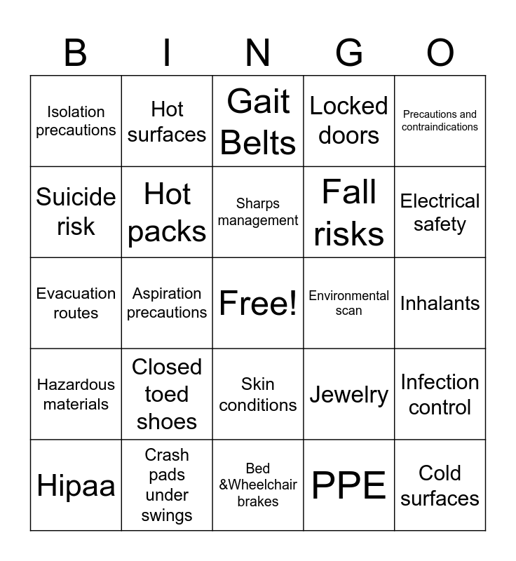 This bingo card has a free space and 24 words: Closed toed shoes, Crash pads under swings, Sharps management, Hipaa, Precautions and contraindications, Isolation precautions, Suicide risk, Hot surfaces, Environmental scan, Skin conditions, Fall risks, Evacuation routes, Jewelry, Infection control, Hot packs, PPE, Inhalants, Gait Belts, Electrical safety, Aspiration precautions, Cold surfaces, Hazardous materials, Locked doors and Bed &Wheelchair brakes.