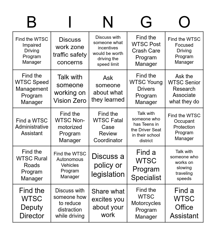 This bingo card has 67 words: Talk with someone who works on motorcycle safety, Talk with someone who works on pedestrian safety, Talk with someone who promotes focused driving, Talk with someone who works on slowing traveling speeds, Talk with someone who works on impaired driving prevention, Discuss school zone traffic safety concerns, Discuss work zone traffic safety concerns, Talk with someone who promotes occupant protection, Ask someone about what they learned, Connect with a new partner, Discuss a policy or legislation, Find your Target Zero Manager, Find the WTSC Occupant Protection Program Manager, Find the WTSC Focused Driving Program Manager, Find the WTSC Tribal Traffic Safety Liaison, Find the WTSC Speed Management Program Manager, Find the WTSC Non-motorized Program Manager, Find the WTSC Impaired Driving Program Manager, Find the WTSC High Visibility Enforcement Program Manager, Find the WTSC Young Drivers Program Manager, Find the WTSC Autonomous Vehicles Program Manager, Find the WTSC Rural Roads Program Manager, Find the WTSC Post Crash Care Program Manager, Find the WTSC Motorcycles Program Manager, Find the WTSC Program Director, Find the WTSC Research and Data Division Director, Find the WTSC Traffic Records Program Manager, Find the WTSC FARS Analyst, Ask the WTSC Senior Research Associate what they do, Find the WTSC CRSS Analyst, Find the WTSC Fatal Case Review Coordinator, Find the WTSC External Relations Director, Find the WTSC Community Engagement Manager, Find the WTSC Communications Manager, Find the WTSC Acting Director, Find the WTSC Deputy Director, Find the WTSC Administrative Services Director, Find a WTSC Program Specialist, Find a WTSC Administrative Assistant, Find a WTSC Office Assistant, Talk with someone inspired by the summit, Talk with someone working on Vision Zero, Talk with someone who has Teens in the Driver Seat in their school district, Talk with someone who helped develop a Local Road Safety Plan, Ask a Law Enforcement Liaison what they do, Ask someone what is their #1 traffic safety concern, Discuss with someone reasons why people speed, Discuss with someone how to reduce distraction while driving, Talk with someone who walks or rides a bike to work/school, Discuss with someone whether getting a ticket changes behavior, Discuss with someone what incentives would be worth driving the speed limit, Discuss with someone why some people don't wear a seatbelt, Discuss with someone why you chose to attend the summit, Discuss with someone the Move Over Slow Down law, Share something that was new information to you, Share what excites you about your work, Share what concerns you most about traffic safety, Share if you took driver's education, Share why a motorcycle endorsement is important, Discuss what you think about automated speed safety cameras, Discuss what you think are key land use traffic safety issues, Talk about who may 'safer vehicle' community partners, Talk about who may be 'safer people' community partners, Talk about who may be 'safer roads' community partners, Talk about who may be 'safer speeds' community partners, Talk about who may be 'post crash care' community partners and Talk about who may be 'safer land use' community partners.