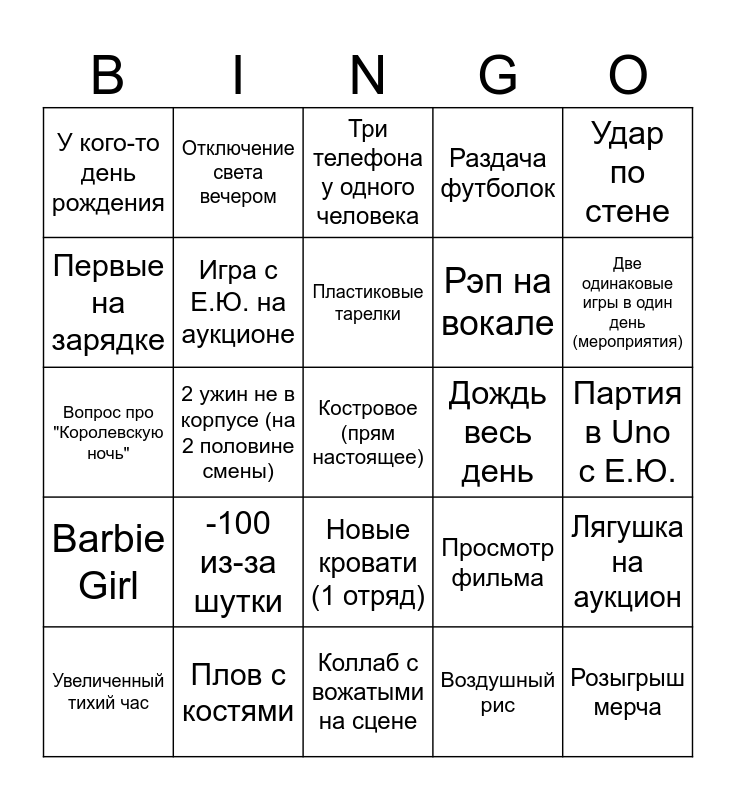 This bingo card has a free space and 24 words: -100 из-за шутки, Плов с костями, Пластиковые тарелки, Увеличенный тихий час, Удар по стене, У кого-то день рождения, Первые на зарядке, Отключение света вечером, Дождь весь день, Новые кровати (1 отряд), Рэп на вокале, Вопрос про "Королевскую ночь", Просмотр фильма, Лягушка на аукцион, Игра с Е.Ю. на аукционе, Воздушный рис, Партия в Uno с Е.Ю., Три телефона у одного человека, Две одинаковые игры в один день (мероприятия), 2 ужин не в корпусе (на 2 половине смены), Розыгрыш мерча, Barbie Girl, Раздача футболок and Коллаб с вожатыми на сцене.
