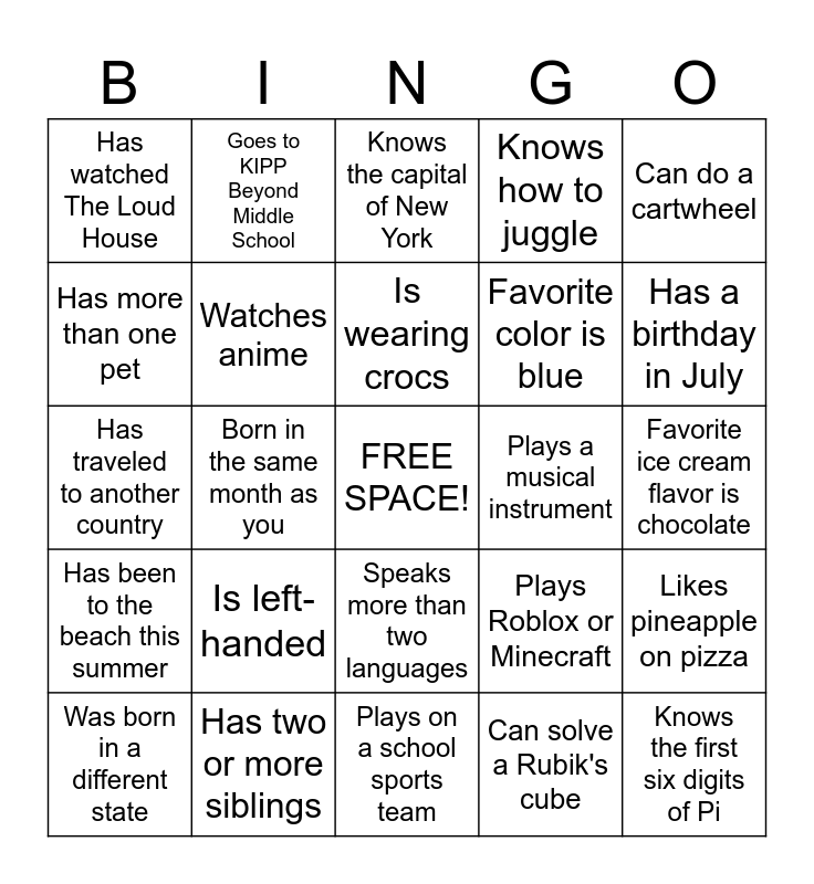 This bingo card has a free space and 24 words: Is left-handed, Has two or more siblings, Is wearing crocs, Was born in a different state, Can do a cartwheel, Has watched The Loud House, Has more than one pet, Goes to KIPP Beyond Middle School, Plays a musical instrument, Speaks more than two languages, Favorite color is blue, Has traveled to another country, Plays Roblox or Minecraft, Likes pineapple on pizza, Watches anime, Can solve a Rubik's cube, Favorite ice cream flavor is chocolate, Knows the capital of New York, Has a birthday in July, Born in the same month as you, Knows the first six digits of Pi, Has been to the beach this summer, Knows how to juggle and Plays on a school sports team.