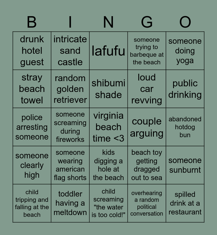 This bingo card has a free space and 29 words: child tripping and falling at the beach, seagull stealing food, someone screaming during fireworks, cigarette on the boardwalk, drunk hotel guest, lafufu, random golden retriever, someone wearing american flag shorts, couple arguing, toddler having a meltdown, abandoned hotdog bun, spilled drink at a restaurant, child screaming "the water is too cold!", overhearing a random political conversation, public drinking, someone holding a baby and a sparkler at the same time, kids digging a hole at the beach, someone clearly high, someone doing yoga, police arresting someone, beach toy getting dragged out to sea, someone blasting their speaker, loud car revving, stray beach towel, someone trying to barbeque at the beach, intricate sand castle, someone sunburnt, shibumi shade and kpop randomly playing.