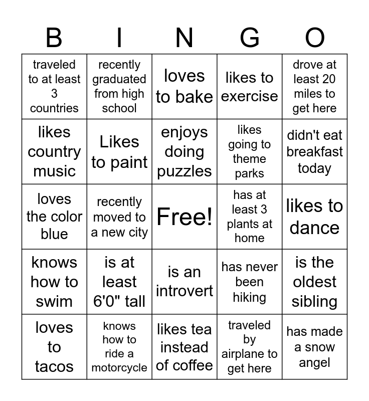 This bingo card has a free space and 34 words: likes to eat sushi, traveled by airplane to get here, is the youngest sibling, loves math, knows how to swim, Likes to paint, drove at least 20 miles to get here, loves to tacos, recently graduated from high school, has read at least 3 books this year, enjoys doing puzzles, loves to bake, has a fish as a pet, plays/played a sport, has at least 3 plants at home, didn't eat breakfast today, knows how to ride a motorcycle, loves the color blue, is at least 6'0" tall, has never been hiking, is an introvert, has a grandson, traveled to at least 3 countries, likes to dance, likes tea instead of coffee, has made a snow angel, likes to exercise, knows how to Double Dutch, likes going to theme parks, likes country music, loves hosting during the holidays, recently moved to a new city, is the oldest sibling and attended a Buccaneers football game.