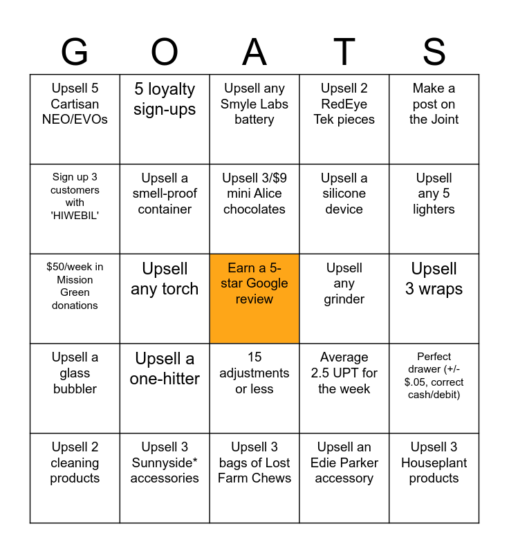 This bingo card has a free space and 24 words: Upsell a one-hitter, Upsell 3 Sunnyside* accessories, Upsell 3/$9 mini Alice chocolates, Upsell 2 cleaning products, Make a post on the Joint, Upsell 5 Cartisan NEO/EVOs, Sign up 3 customers with 'HIWEBIL', 5 loyalty sign-ups, Upsell any grinder, 15 adjustments or less, Upsell a silicone device, $50/week in Mission Green donations, Average 2.5 UPT for the week, Perfect drawer (+/- $.05, correct cash/debit), Upsell a smell-proof container, Upsell an Edie Parker accessory, Upsell 3 wraps, Upsell any Smyle Labs battery, Upsell any 5 lighters, Upsell any torch, Upsell 3 Houseplant products, Upsell a glass bubbler, Upsell 2 RedEye Tek pieces and Upsell 3 bags of Lost Farm Chews.