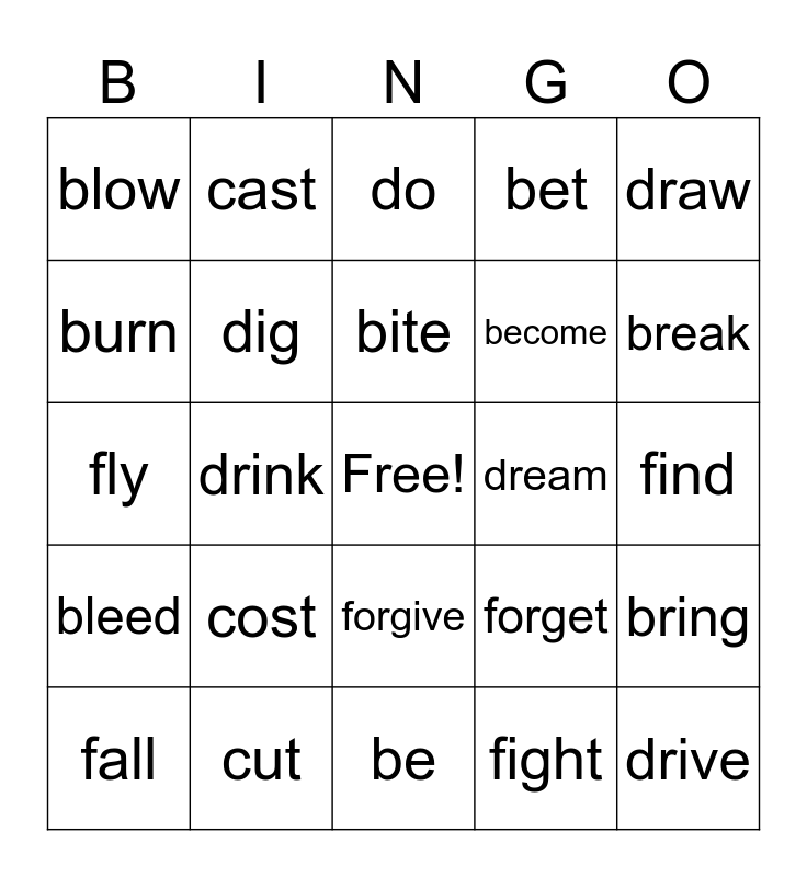 This bingo card has a free space and 24 words: cost, cut, bite, fall, draw, blow, burn, cast, dream, forgive, become, fly, forget, bring, dig, fight, find, do, break, drink, drive, bleed, bet and be.