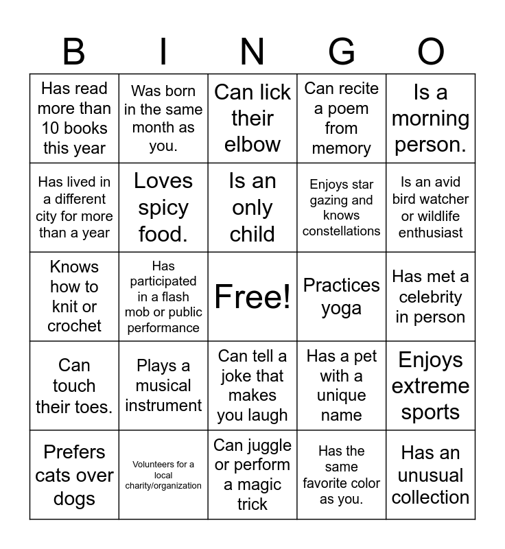 This bingo card has a free space and 34 words: Has traveled to more than 3 countries, Has the same favorite color as you., Can wiggle their ears., Can do an impression of an animal., Can touch their toes., Loves spicy food., Is a morning person., Prefers cats over dogs, Was born in the same month as you., Can whistle, Is an only child, Can lick their elbow, Can speak three languages fluently, Loves to cook, Practices yoga, Is an avid bird watcher or wildlife enthusiast, Volunteers for a local charity/organization, Knows how to knit or crochet, Plays a musical instrument, Has a pet with a unique name, Can tell a joke that makes you laugh, Enjoys gardening and has a green thumb, Has read more than 10 books this year, Has met a celebrity in person, Can juggle or perform a magic trick, Has an unusual collection, Can recite a poem from memory, Has a hidden talent most people don’t know about, Enjoys star gazing and knows constellations, Has lived in a different city for more than a year, Can play chess and knows strategies, Has participated in a flash mob or public performance, Enjoys extreme sports and Had a broken bone.