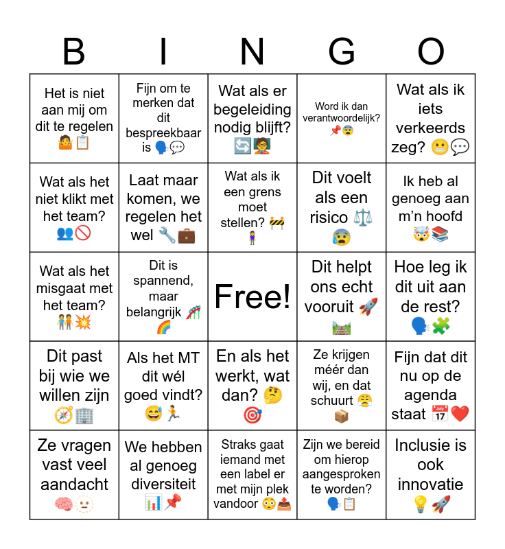 This bingo card has a free space and 59 words: Wordt dit iets structureels of gewoon voor nu? ๐โ, We hebben al genoeg diversiteit ๐๐, Wat als het niet werkt? ๐ฃ๐งฏ, Dit past bij wie we willen zijn ๐งญ๐ข, Zijn we bereid om hierop aangesproken te worden? ๐ฃ๏ธ๐, We gaan het gewoon proberen ๐ช๐, Laat maar komen, we regelen het wel ๐ง๐ผ, Wat als er klachten komen? ๐ฃ๏ธ๐ฃ, Dit voelt als een risico โ๏ธ๐ฐ, Iedereen heeft iets bij te dragen ๐ง ๐ฌ, Word ik dan verantwoordelijk? ๐๐จ, Straks moeten we het beleid aanpassen ๐๐ฅ, Wat als het niet klikt met het team? ๐ฅ๐ซ, Dit maakt ons een modernere werkgever ๐ข๐, Wat als ze veel aandacht vragen? ๐ง ๐ซฅ, Het is niet aan mij om dit te regelen ๐คท๐, Inclusie is ook innovatie ๐ก๐, Wat als ik iets verkeerds zeg? ๐ฌ๐ฌ, Ik weet niet wat ik moet zeggen ๐ถ๐, Wat als ik een grens moet stellen? ๐ง๐งโโ๏ธ, Dit helpt ons echt vooruit ๐๐ค๏ธ, Wat als er begeleiding nodig blijft? ๐๐งโ๐ซ, Ze vragen vast veel aandacht ๐ง ๐ซฅ, Fijn dat dit nu op de agenda staat ๐ โค๏ธ, Dit voelt als extra werk ๐๐ค, Is er wel een goede plek voor hen? ๐ชโ, Ik wil hier wel ambassadeur voor zijn ๐ฃ๐งก, Past dit wel binnen ons beleid? ๐๐งฉ, Ik heb al genoeg aan mโn hoofd ๐คฏ๐, Ik voel me er niet zeker over ๐๐, Hoe moet ik diegene begeleiden? ๐งญ๐ , Dit is een kans die we moeten grijpen ๐ก๐ฏ, Dit geeft ons een ander perspectief ๐ญ๐, We kunnen hier echt iets betekenen ๐๐, Fijn om te merken dat dit bespreekbaar is ๐ฃ๏ธ๐ฌ, Ik heb daar geen ervaring mee ๐๐, Daar ben ik niet voor opgeleid ๐๐, Dit is spannend, maar belangrijk ๐ข๐, Ik wil hieraan bijdragen ๐โโ๏ธโจ, Wat als het misgaat met het team? ๐งโ๐คโ๐ง๐ฅ, Het voelt goed om ruimte te maken ๐๐ , Als het MT dit wรฉl goed vindt? ๐ ๐, Hoe leg ik dit uit aan de rest? ๐ฃ๏ธ๐งฉ, Wat als ze niet passen in onze structuur? ๐งฉ๐ข, Ik weet niet hoe ik dit moet aanpakken ๐คท๐, Dit is iets waar we samen sterker uitkomen ๐งฑ๐ฑ, Kunnen we dit wel goed monitoren? ๐งฎ๐, Is dit niet vooral symbolisch? ๐ญ๐คจ, En als het werkt, wat dan? ๐ค๐ฏ, Straks gaat iemand met een label er met mijn plek vandoor ๐ณ๐ค, Hebben ze nou echt mรฉรฉr recht op die functie dan ik? ๐ค๐, Ik voel me gepasseerd omwille van een quotum ๐๐, Is dit niet gewoon om de cijfers op te leuken? ๐๐, Moet ik straks mijn taken inleveren omdat iemand 'beschermd' is? ๐ก๏ธ๐, Waarom krijgen zij wel maatwerk en ik niet? ๐ง๐งโ๐ง, Ze krijgen mรฉรฉr dan wij, en dat schuurt ๐ค๐ฆ, Zo wordt het geen gelijke kansen meer โ๏ธโ, Is dit nog eerlijk tegenover de rest van het team? ๐งโ๐คโ๐งโ ๏ธ and Als ik het fout doe, vlieg ik eruit โ zij blijven toch wel ๐ฌ๐.