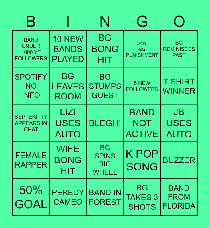 This bingo card has a free space and 24 words: WIFE BONG HIT, PEREDY CAMEO, BG STUMPS GUEST, 50% GOAL, BG REMINISCES PAST, BAND UNDER 1000 YT FOLLOWERS, SPOTIFY NO INFO, 10 NEW BANDS PLAYED, BAND NOT ACTIVE, BG SPINS BIG WHEEL, 5 NEW FOLLOWERS, SEPTEKITTY APPEARS IN CHAT, K POP SONG, BUZZER, BG LEAVES ROOM, BG TAKES 3 SHOTS, JB USES AUTO, BG BONG HIT, T SHIRT WINNER, LIZI USES AUTO, BAND FROM FLORIDA, FEMALE RAPPER, ANY BG PUNISHMENT and BAND IN FOREST.