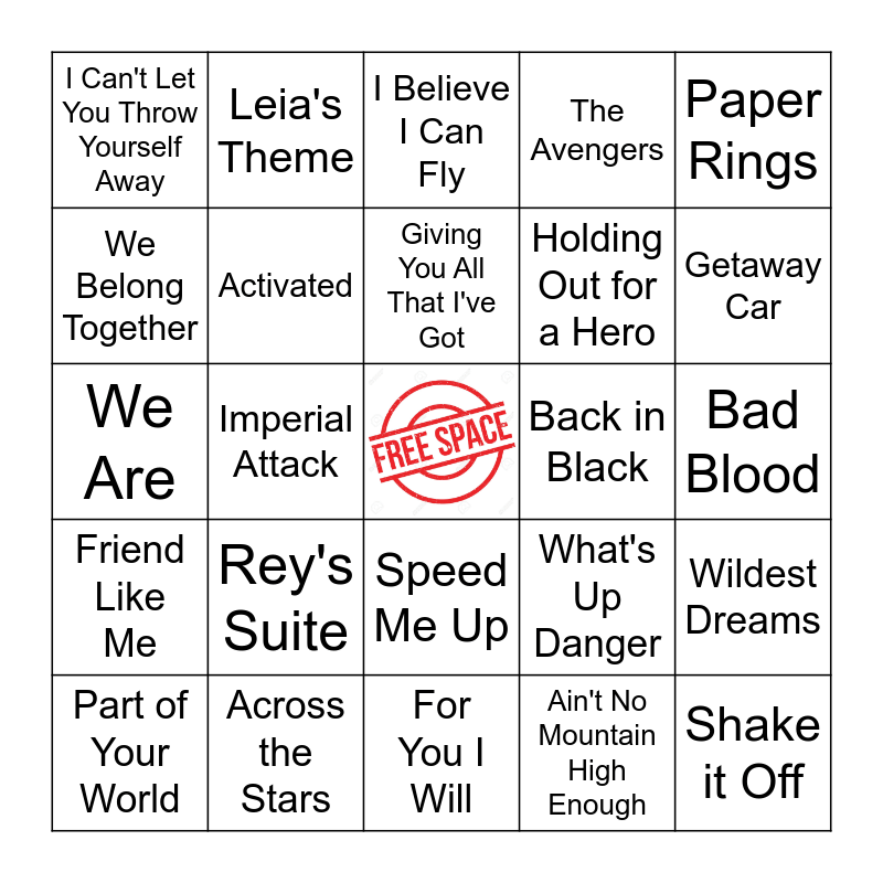 This bingo card has a free space and 49 words: You've Got a Friend in Me, Main Theme, Space Jam, Ain't No Mountain High Enough, Bad Blood, When She Loved Me, Leia's Theme, Fly Like an Eagle, Holding Out for a Hero, You Belong With Me, We Belong Together, Imperial Attack, What's Up Danger, Shake it Off, Strange Things, Throne Room, I Believe I Can Fly, Back in Black, Love Story, I Can't Let You Throw Yourself Away, Across the Stars, For You I Will, The Avengers, Paper Rings, Woody's Roundup, Rey's Suite, Giving You All That I've Got, Superman Theme, Wildest Dreams, Friend Like Me, Anthem of Evil, Speed Me Up, Heroes, Look What You Made Me Do, Part of Your World, The Mandalorian, Can't Stop the Feeling, All the Stars, Getaway Car, Carried Me With You, Hey Mando, Try Everything, Sunflower, I Did Something Bad, We Are, Activated, Together Now, Hooked on a Feeling and Mad Woman.