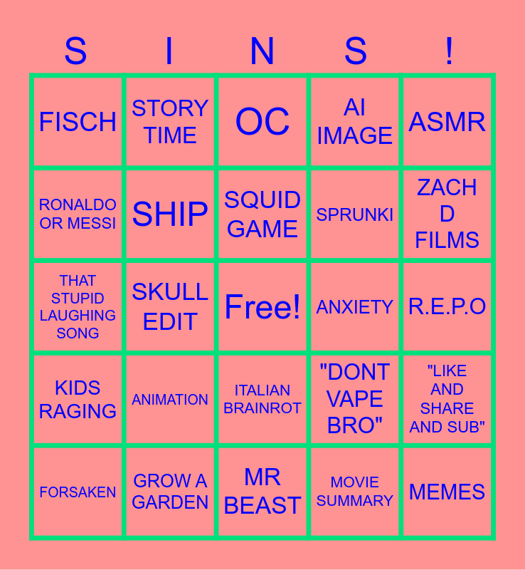 This bingo card has a free space and 29 words: FORSAKEN, CASEOH, SKULL EDIT, "DON'T CLICK THE SOUND", FISCH, OC, SHIP, ANIMATION, ANXIETY, GROW A GARDEN, R.E.P.O, MEMES, MR BEAST, MOVIE SUMMARY, ZACH D FILMS, HISTORY, ITALIAN BRAINROT, KIDS RAGING, ASMR, THAT STUPID LAUGHING SONG, "DONT VAPE BRO", MISHEARD LYRICS, SPRUNKI, RONALDO OR MESSI, AI IMAGE, STORY TIME, "LIKE AND SHARE AND SUB", SQUID GAME and MINECRAFT.