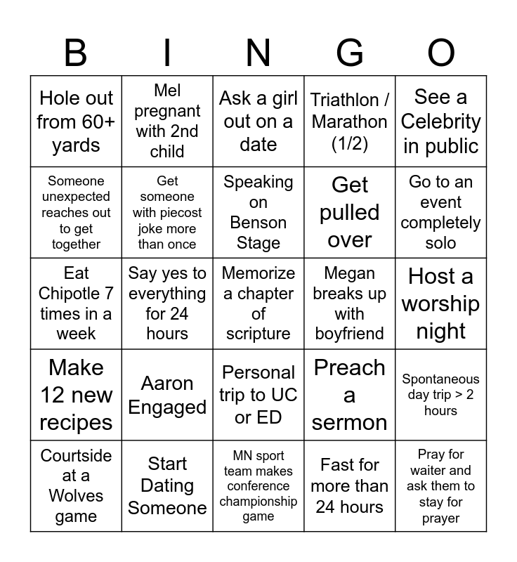 This bingo card has a free space and 24 words: Aaron Engaged, Start Dating Someone, Speaking on Benson Stage, Courtside at a Wolves game, See a Celebrity in public, Hole out from 60+ yards, Someone unexpected reaches out to get together, Mel pregnant with 2nd child, Megan breaks up with boyfriend, Personal trip to UC or ED, Get pulled over, Eat Chipotle 7 times in a week, Preach a sermon, Spontaneous day trip > 2 hours, Get someone with piecost joke more than once, Fast for more than 24 hours, Host a worship night, Ask a girl out on a date, Go to an event completely solo, Say yes to everything for 24 hours, Pray for waiter and ask them to stay for prayer, Make 12 new recipes, Triathlon / Marathon (1/2) and MN sport team makes conference championship game.