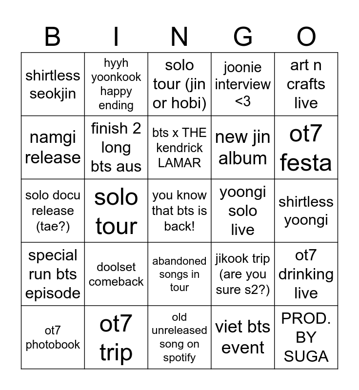 This bingo card has a free space and 24 words: doolset comeback, ot7 trip, bts x THE kendrick LAMAR, ot7 photobook, art n crafts live, shirtless seokjin, namgi release, hyyh yoonkook happy ending, yoongi solo live, abandoned songs in tour, new jin album, solo docu release (tae?), jikook trip (are you sure s2?), ot7 drinking live, finish 2 long bts aus, viet bts event, shirtless yoongi, solo tour (jin or hobi), ot7 festa, solo tour, PROD. BY SUGA, special run bts episode, joonie interview <3 and old unreleased song on spotify.