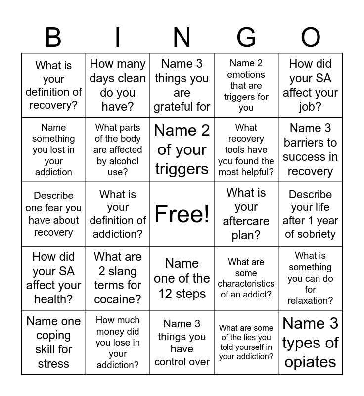 This bingo card has a free space and 24 words: What are 2 slang terms for cocaine?, How much money did you lose in your addiction?, Name 2 of your triggers, Name one coping skill for stress, How did your SA affect your job?, What is your definition of recovery?, Name something you lost in your addiction, How many days clean do you have?, What is your aftercare plan?, Name one of the 12 steps, What recovery tools have you found the most helpful?, Describe one fear you have about recovery, What are some characteristics of an addict?, What is something you can do for relaxation?, What parts of the body are affected by alcohol use?, What are some of the lies you told yourself in your addiction?, Describe your life after 1 year of sobriety, Name 3 things you are grateful for, Name 3 barriers to success in recovery, What is your definition of addiction?, Name 3 types of opiates, How did your SA affect your health?, Name 2 emotions that are triggers for you and Name 3 things you have control over.