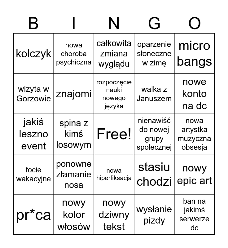 This bingo card has a free space and 24 words: ponowne złamanie nosa, nowy kolor włosów, rozpoczęcie nauki nowego języka, pr*ca, micro bangs, kolczyk, wizyta w Gorzowie, nowa choroba psychiczna, nienawiść do nowej grupy społecznej, nowa hiperfiksacja, walka z Januszem, jakiś leszno event, stasiu chodzi, nowy epic art, znajomi, wysłanie pizdy, nowa artystka muzyczna obsesja, całkowita zmiana wyglądu, nowe konto na dc, spina z kimś losowym, ban na jakimś serwerze dc, focie wakacyjne, oparzenie słoneczne w zimę and nowy dziwny tekst.