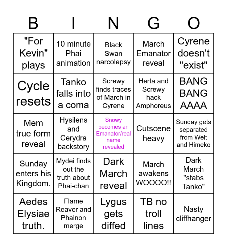 This bingo card has a free space and 24 words: Mydei finds out the truth about Phai-chan, Flame Reaver and Phainon merge, Screwy finds traces of March in Cyrene, Aedes Elysiae truth., Cyrene doesn't "exist", "For Kevin" plays, Cycle resets, 10 minute Phai animation, Cutscene heavy, Dark March reveal, Herta and Screwy hack Amphoreus, Mem true form reveal, March awakens WOOOO!!, Dark March "stabs Tanko", Tanko falls into a coma, TB no troll lines, Sunday gets separated from Welt and Himeko, Black Swan narcolepsy, BANG BANG AAAA, Hysilens and Cerydra backstory, Nasty cliffhanger, Sunday enters his Kingdom., March Emanator reveal and Lygus gets diffed.