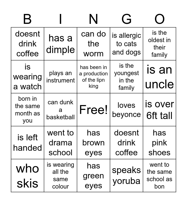 This bingo card has a free space and 34 words: can change a tire, speaks yoruba, has an xbox, supports liverpool, is left handed, plays an instrument, is the oldest in their family, who skis, has a dimple, has a song on spotify, has been in a production of the lipn king, can do the worm, is wearing contacts, can do a death drop, loves beyonce, is an uncle, is wearing all the same colour, born in the same month as you, went to drama school, doesnt drink coffee, has brown eyes, knows someone famous, doesnt drink coffee, is over 6ft tall, has green eyes, went to the same school as bon, is allergic to cats and dogs, cant drive a car, is the youngest in the family, is wearing a watch, has more than one degree, can dunk a basketball, has pink shoes and longs for winter.