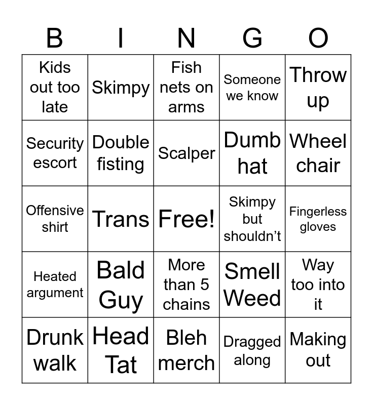 This bingo card has a free space and 24 words: Bald Guy, Head Tat, Scalper, Drunk walk, Throw up, Kids out too late, Security escort, Skimpy, Skimpy but shouldn’t, More than 5 chains, Dumb hat, Offensive shirt, Smell Weed, Way too into it, Double fisting, Dragged along, Fingerless gloves, Fish nets on arms, Wheel chair, Trans, Making out, Heated argument, Someone we know and Bleh merch.