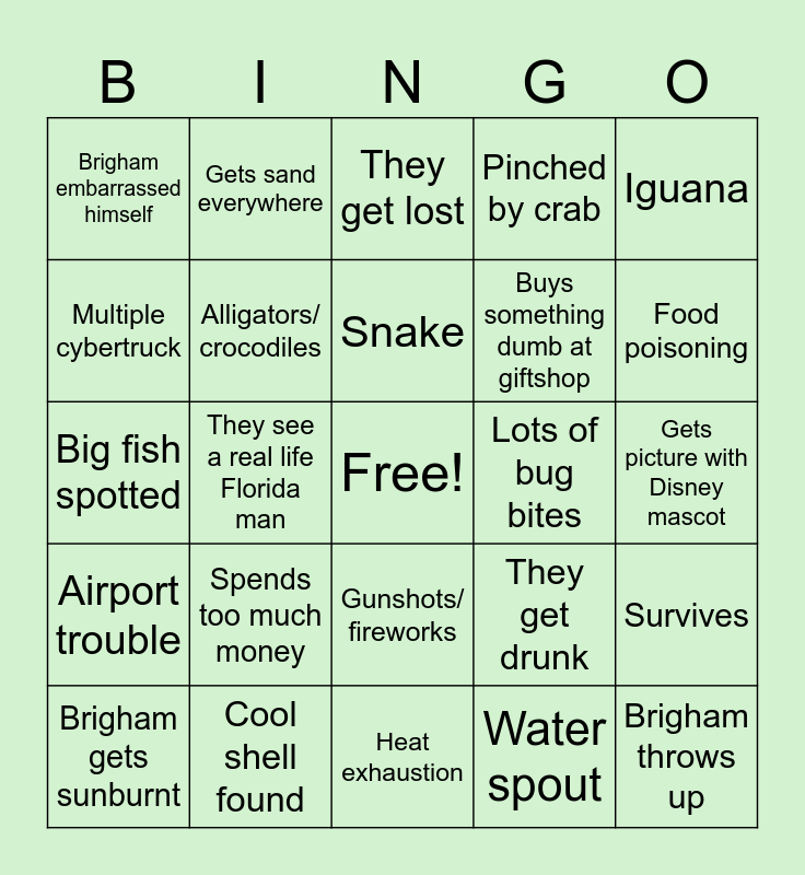 This bingo card has a free space and 29 words: Brigham gets sunburnt, Brigham almost drowns, They see a real life Florida man, Gets stung by jellyfish, Brigham embarrassed himself, They get lost, Alligators/ crocodiles, Spends too much money, Lots of bug bites, Cool shell found, Gets picture with Disney mascot, Brigham throws up, Heat exhaustion, Water spout, Food poisoning, Big spider, Gunshots/ fireworks, Airport trouble, Iguana, Big fish spotted, They get drunk, Builds a sandcastle, Buys something dumb at giftshop, Multiple cybertruck, Pinched by crab, Gets sand everywhere, Survives, Snake and Elon rocket.