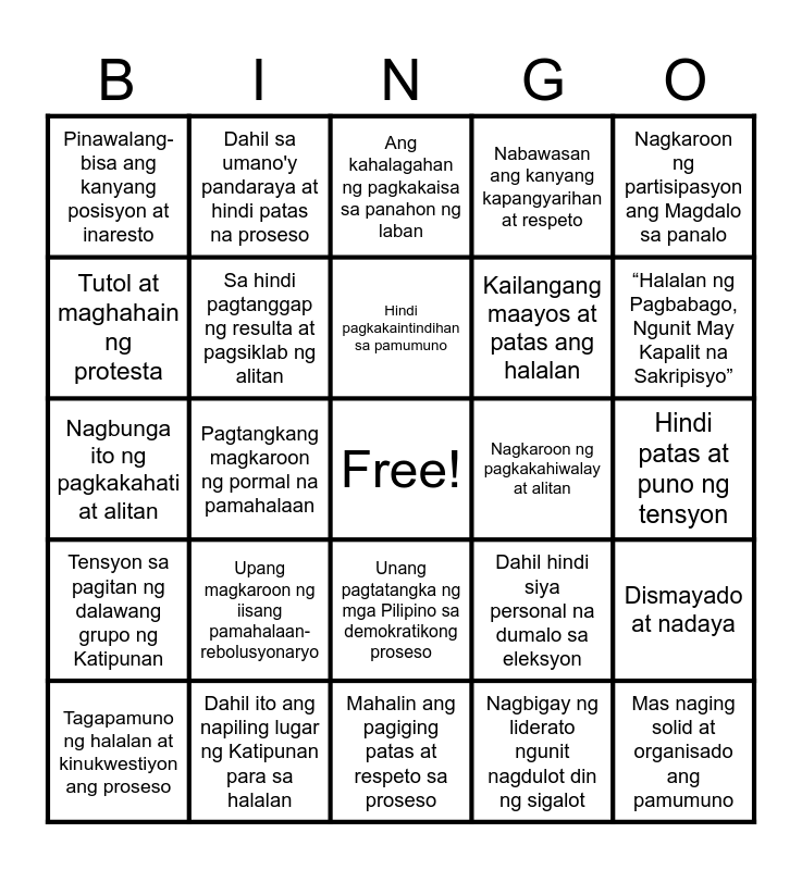 This bingo card has a free space and 24 words: Upang magkaroon ng iisang pamahalaan-rebolusyonaryo, Dahil ito ang napiling lugar ng Katipunan para sa halalan, Hindi pagkakaintindihan sa pamumuno, Tagapamuno ng halalan at kinukwestiyon ang proseso, Nagkaroon ng partisipasyon ang Magdalo sa panalo, Pinawalang-bisa ang kanyang posisyon at inaresto, Tutol at maghahain ng protesta, Dahil sa umano'y pandaraya at hindi patas na proseso, Nagkaroon ng pagkakahiwalay at alitan, Unang pagtatangka ng mga Pilipino sa demokratikong proseso, Kailangang maayos at patas ang halalan, Nagbunga ito ng pagkakahati at alitan, Dahil hindi siya personal na dumalo sa eleksyon, Dismayado at nadaya, Sa hindi pagtanggap ng resulta at pagsiklab ng alitan, Nagbigay ng liderato ngunit nagdulot din ng sigalot, Hindi patas at puno ng tensyon, Ang kahalagahan ng pagkakaisa sa panahon ng laban, “Halalan ng Pagbabago, Ngunit May Kapalit na Sakripisyo”, Pagtangkang magkaroon ng pormal na pamahalaan, Mas naging solid at organisado ang pamumuno, Tensyon sa pagitan ng dalawang grupo ng Katipunan, Nabawasan ang kanyang kapangyarihan at respeto and Mahalin ang pagiging patas at respeto sa proseso.